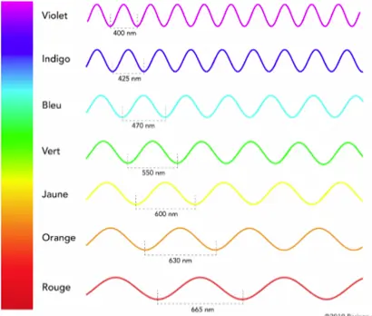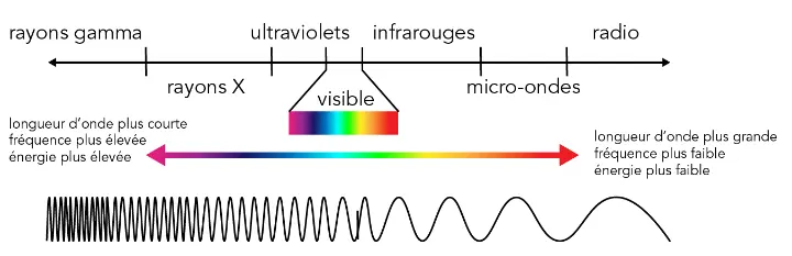 Ce spectre s’étend de l’infrarouge (fréquence basse, énergie faible, longueur d’onde longue) à l’ultraviolet (fréquence élevée, énergie forte, longueur d’onde courte).